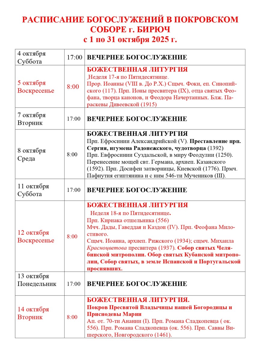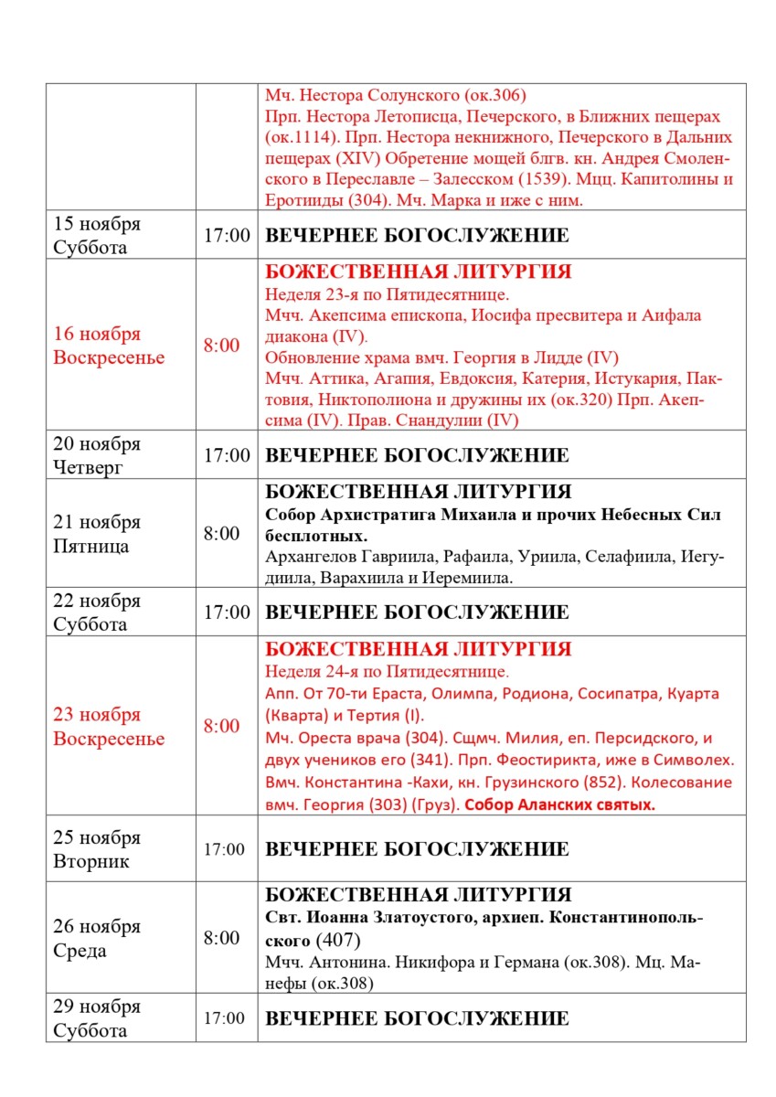 Расписание богослужений